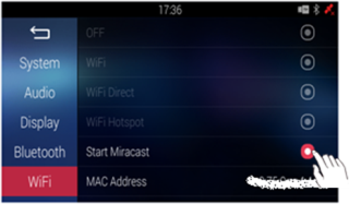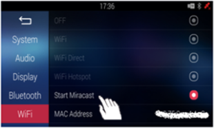 "Start Miracast" is a WiFi setting on iAuto Device. When on, the iAuto Device will wait to be connected. Turn on "Start Miracast" in WiFi settings and click "Start Miracast", then iAuto Device will be in connection waiting status. When smartphone and iAuto Device are connected, iAuto Device will display the smartphone screen synchronously, entering the mode of mirror mutual control.